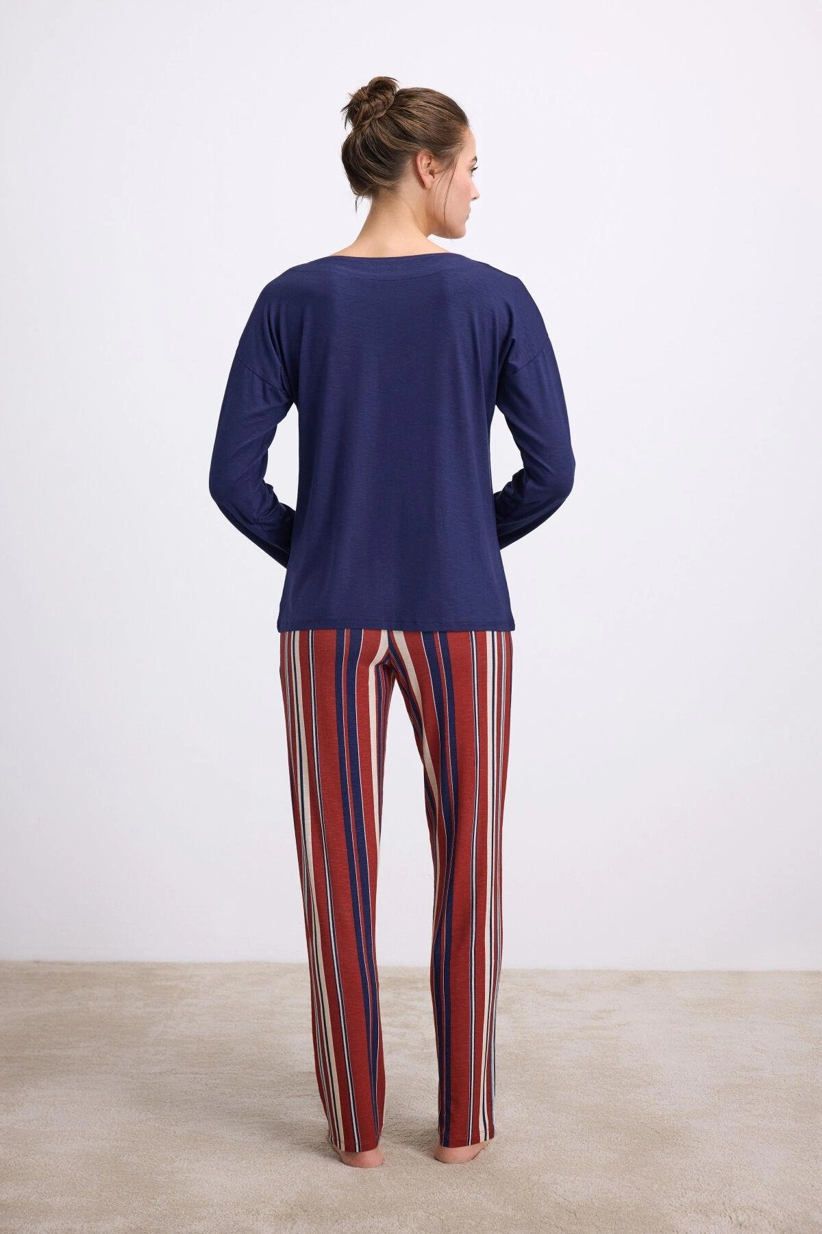 Lacivert uzun kollu T-shirt sade ve modern çizgileriyle şık bir görünüm sunarken, çizgili rahat kesim pantolon ise esnek bel yapısıyla konforlu bir uyum sağlar. Hem gece uykusunda hem de evde dinlenirken maksimum rahatlık isteyenler için ideal bir kombinasyon.