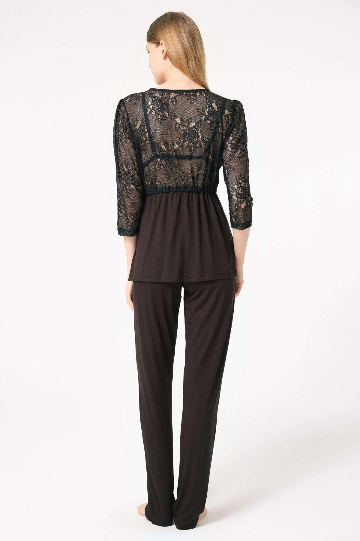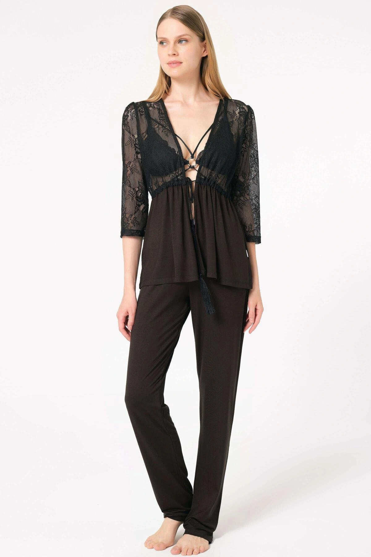 Anıl 5698 Fantezi Dekolte ev giyimi ip askılı v yaka Kadın kadife düz kışlık örme normal bel uzun Diz_Altı Bağlamalı Uzun Paçalı dantel detaylı Pijama Takımı sabahlık modelimiz0