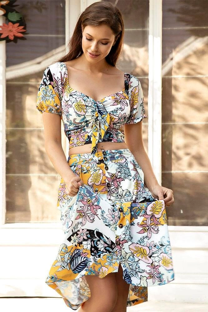 Yaz mevsiminin enerjisini taşıyan bu iki parçalı takım; romantik çiçek desenleri, hafif dokuma kumaşı ve zarif detaylarıyla öne çıkar. Omzu düşük ve önden bağlamalı büstiyer, feminen bir duruş sergilerken; düğme detaylı midi boy etek ile kombininizi zahmetsizce tamamlarsınız. Günlük şıklık, tatil stili ya da şehirde romantik bir akşam için mükemmel bir seçim!