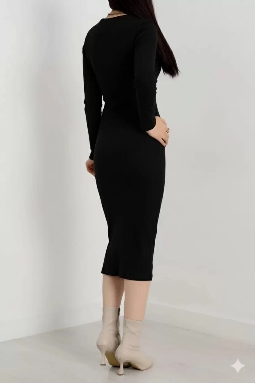 Bu şık elbise, vücudu saran fitilli kesimiyle modern bir görünüm sunarken, fermuar detayıyla da fark yaratıyor.