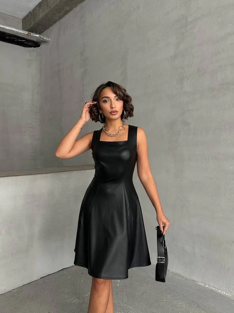 Kare yaka deri elbise siyah h24442--Şıklık ve zarafetin buluştuğu Kare Yaka Deri Elbise Siyah H24442, gardırobunuzun vazgeçilmezi olmaya aday! Ürün Özellikleri: Kare yaka tasarımı ile modern bir görünüm sunar. Kaliteli deri malzeme kullanılarak üretilmiştir. Siyah rengi ile her tarza kolayca uyum sağlar. Bel kısmında bulunan ince kemer detayıyla şıklığınızı ön plana çıkarır. Vücuda oturan kesimiyle, feminin bir silüet oluşturur. Özel davetlerden iş toplantılarına kadar geniş bir kullanım alanına sahiptir. Bu benzersiz elbise ile şıklığı ve rahatlığı bir arada bulacaksınız. Kendinizi özel ve güçlü hissetmek istediğiniz her an tercih edebileceğiniz bir parça!