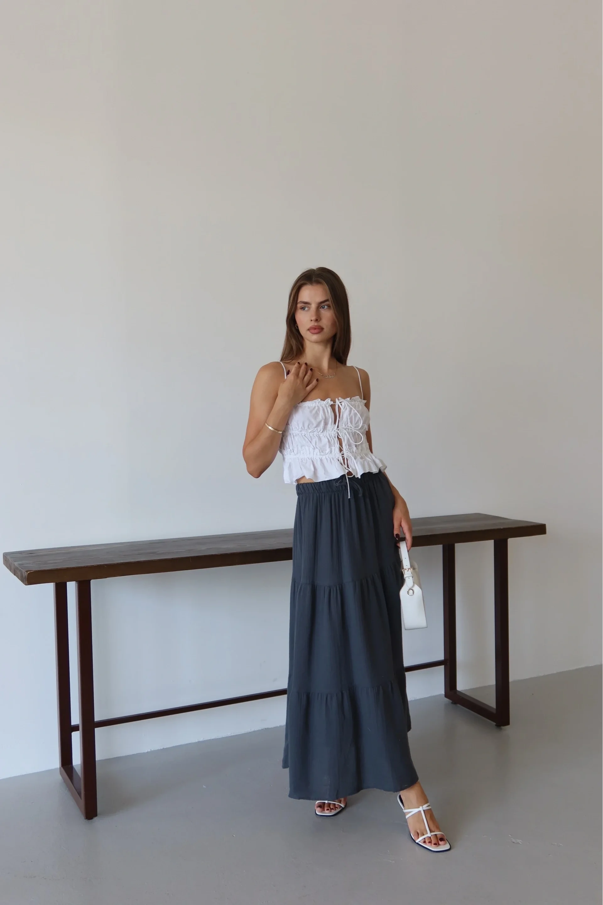 Yüksek kaliteli müslin ve keten karışımı ile üretilmiş uzun etek, gardırobunuzun vazgeçilmezi olmaya aday. Antrasit rengiyle şıklığı ve zarafeti bir arada sunan bu etek, her tarza kolaylıkla uyum sağlar. Rahat kesimi sayesinde gün boyu konfor sunarken, şık detaylarıyla da göz kamaştırır.