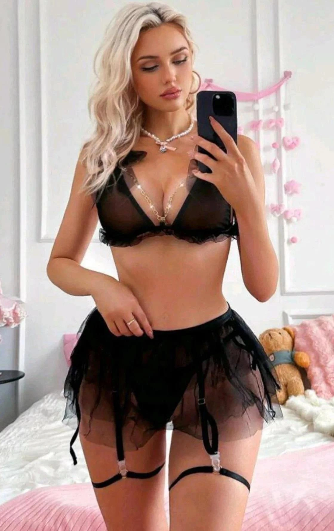 Transparan Siyah Zincir Detaylı Fantezi Tül Etekli Jartiyer Takımı